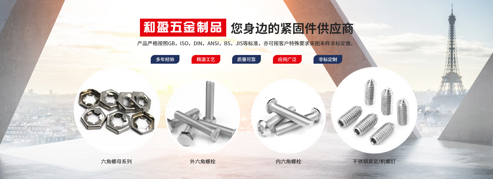 興化市和盈五金制品有限公司創建于2010年,坐落在全國不銹鋼名鎮———江蘇戴南。本公司集當地不銹鋼優勢和全國銷售網點,以不銹鋼緊固件產品為主體的企業。我們將始終如一的堅持以客戶為中心,堅持以品質取勝的發展戰略,依靠科學技術不斷創新。秉承這種精神,我們一起和諧合作,共贏未來。產品嚴格按照GB,ISO,DIN,ANSI,BS,JIS等標準,亦可按客戶特殊要求來圖來樣非標定做。產品廣泛應用......
